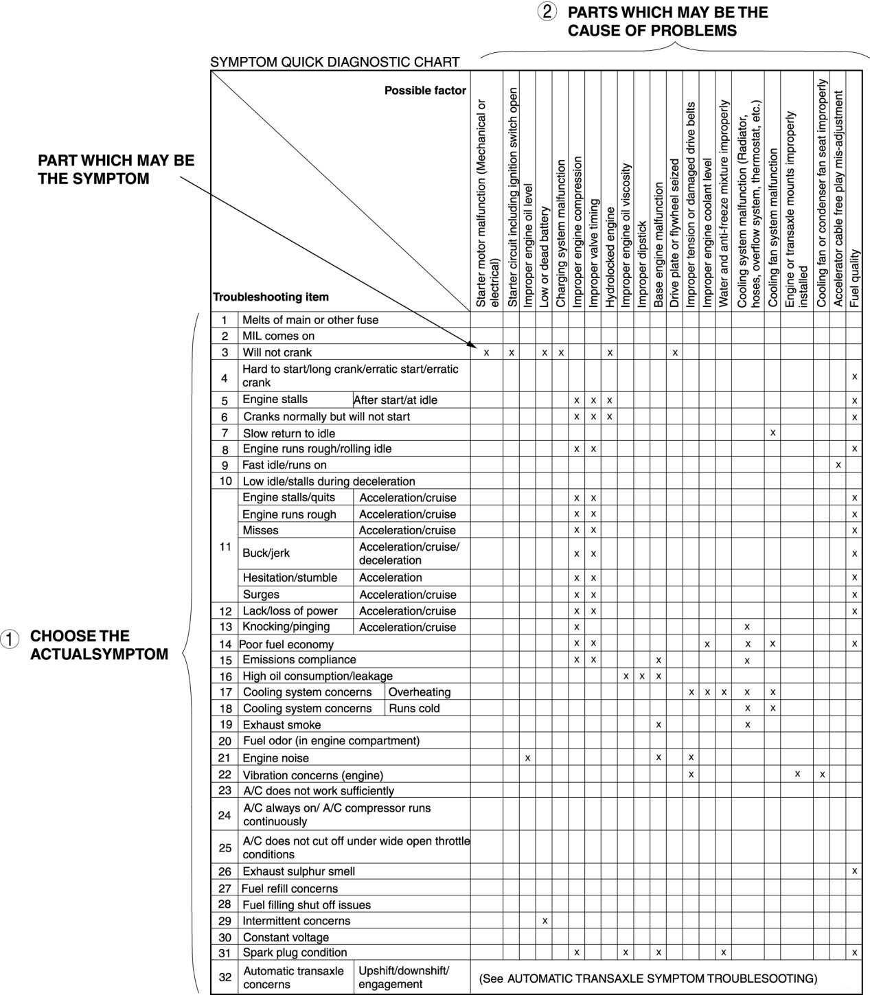 - The chart is effective in quickly narrowing down the relation between symptom and cause of the malfunction. It also specifies a range of common causes when multiple malfunction symptoms occur.