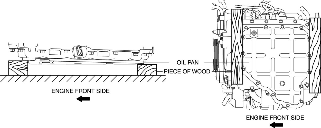 - The oil pan could be damaged or dented if the engine's own weight is subjected to an impact against a level surface. Always set two pieces of wood in the positions shown in the figure to prevent the oil pan from being dented. If the oil pan is dented, the amount of intake oil and the fluid pressure will decrease.