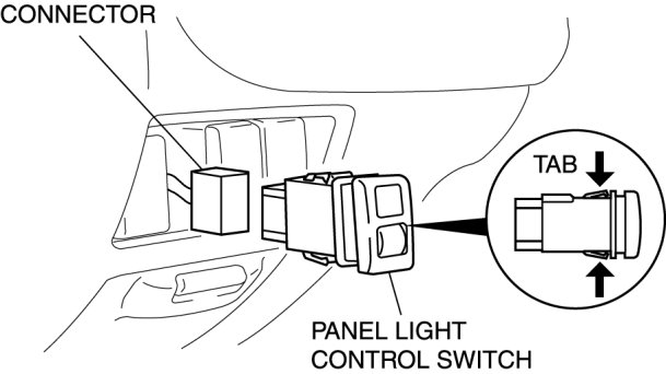 1. Reach into the dashboard through the underside of the lower panel and, while pushing on the tabs of the panel light control switch, pull it outward.