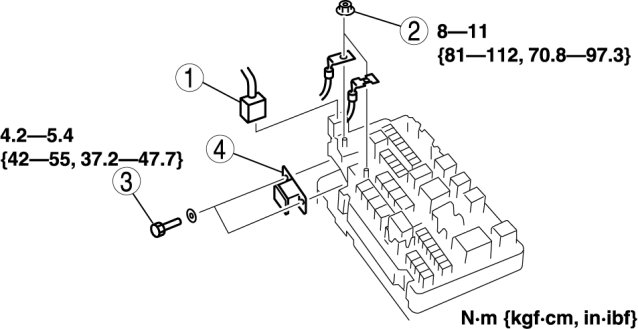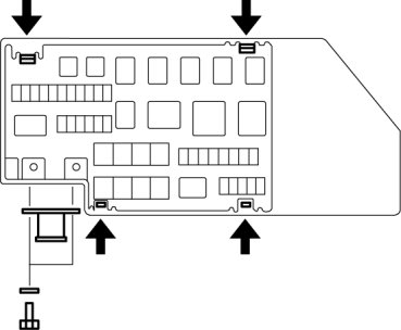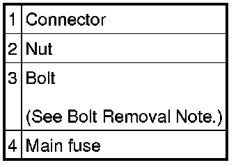 1. Press the tabs in the direction indicated by the arrows, lift the main fuse block, and then remove the bolt.
