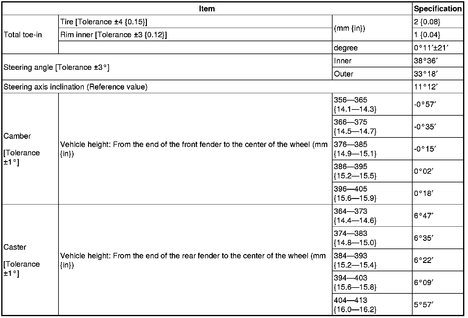 - Difference between the left and right dimension for camber and caster is within 1°.