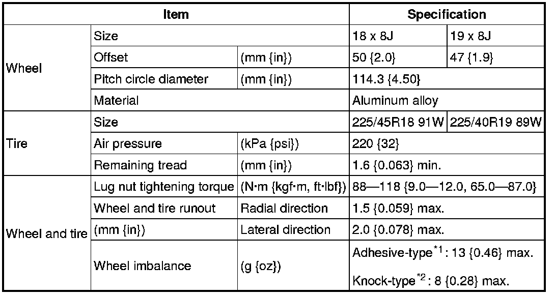 One balance weight: 60 g {2.12 oz} max. If the total weight exceeds 100 g {3.53 oz} on one side, rebalance after moving the tire around on the rim. Do not use three or more balance weights.
