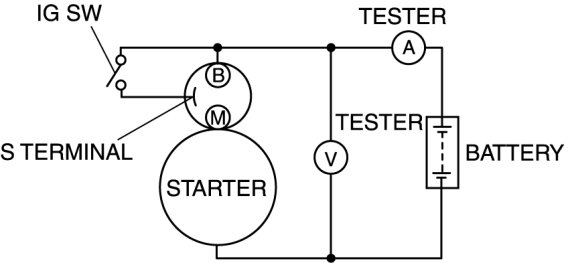 2. Connect the starter, battery, and a tester as shown in the figure.