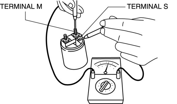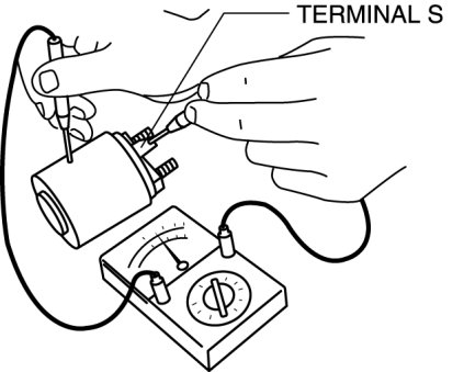 1. Verify that the starter motor pinion is extended while battery positive voltage is connected to terminal S and the starter body is grounded.