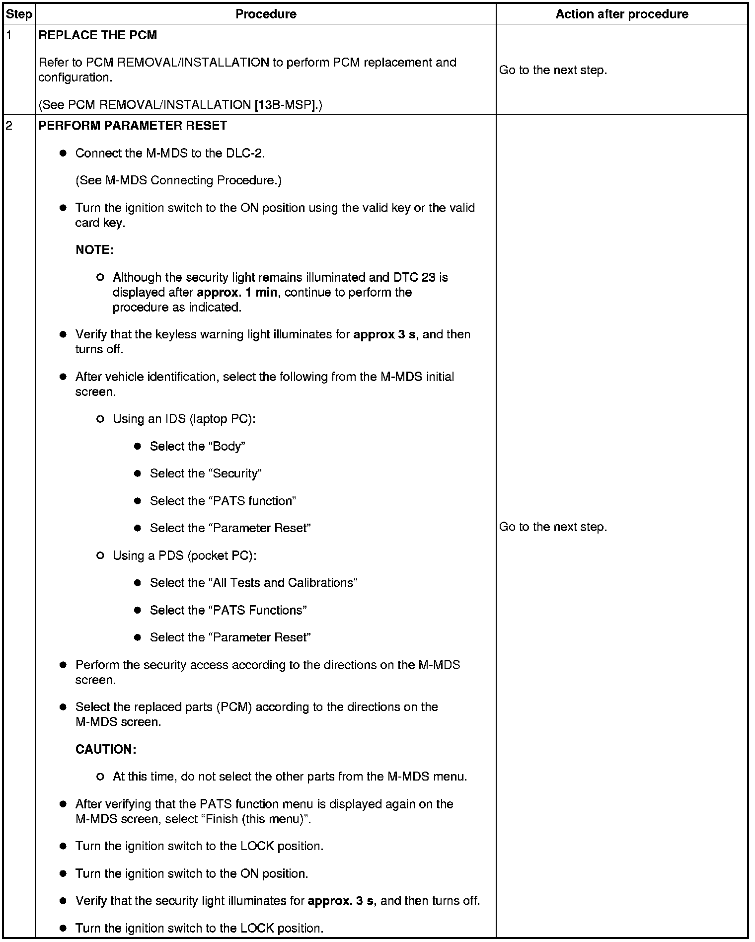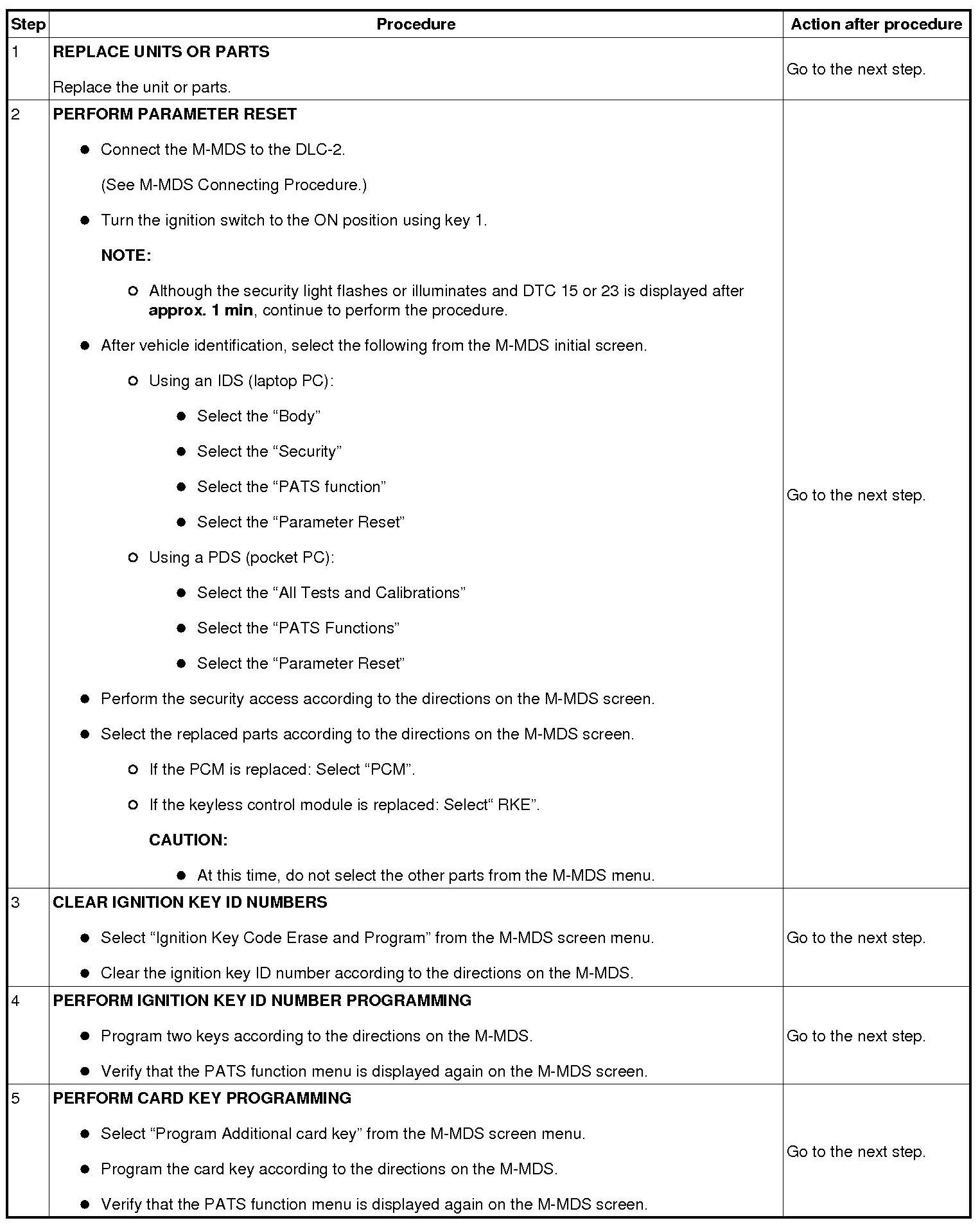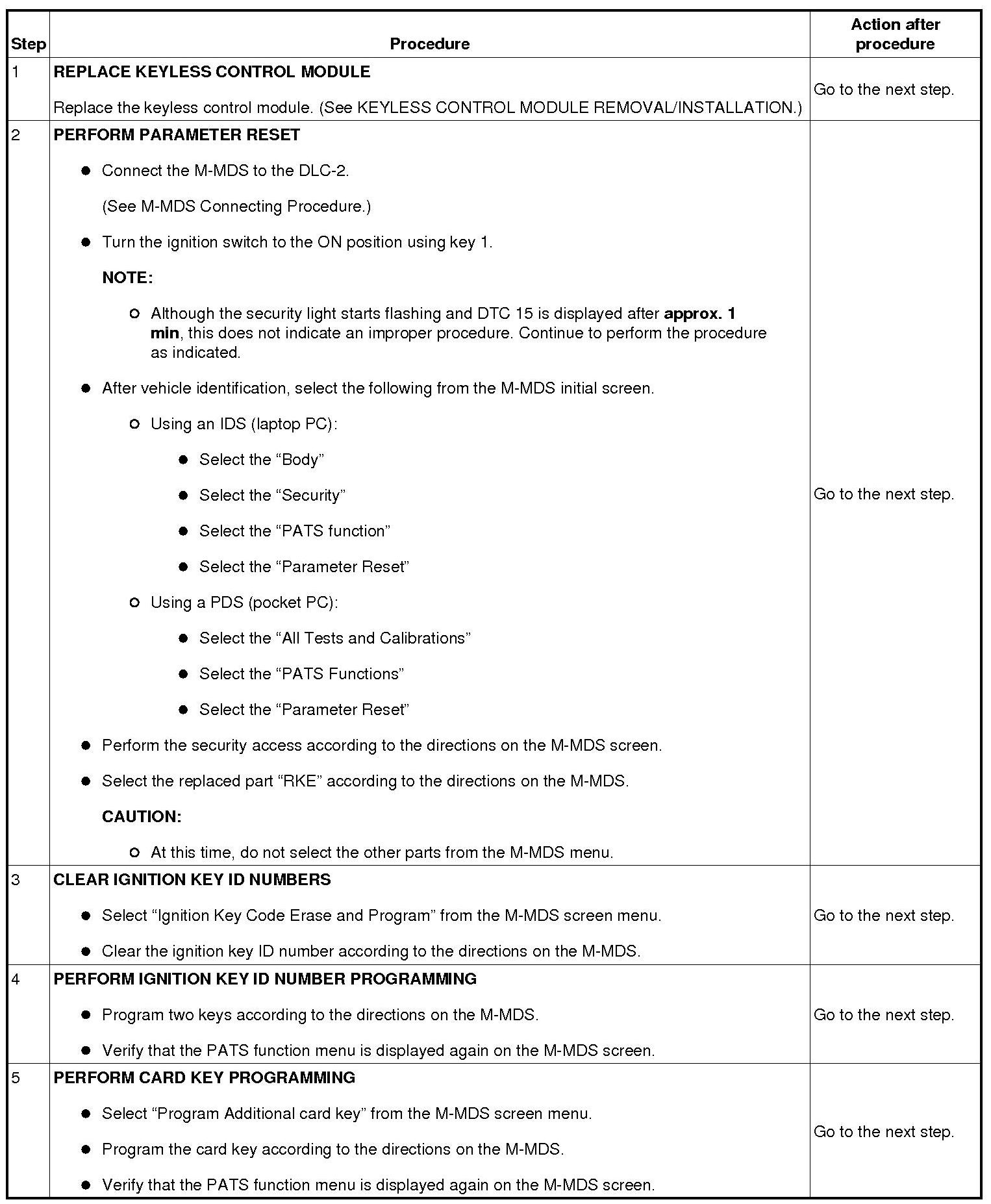 No.7 Programming Procedure Due to Simultaneous Replacement of Immobilizer System-related Parts (PCM, Keyless Control Module, and Steering Lock Unit)