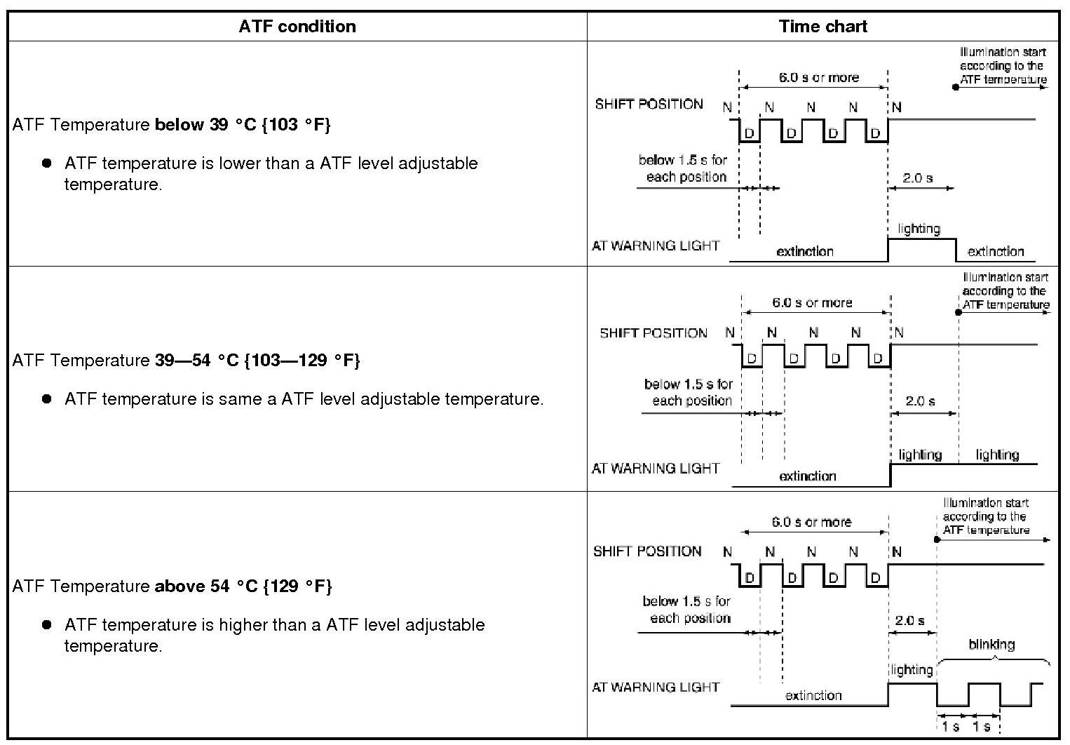 - Continue the shifting operation from N to D, D to N within 1.5 s until the AT warning light illuminates.
