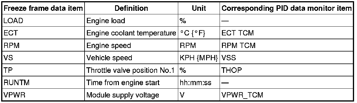 - For the freeze frame data, if there are several malfunctions in the engine control system, the data for the malfunction which occurred initially is stored. Thereafter, if a misfire or fuel injection control malfunction occurs, data from the misfire or fuel injection control malfunction is written over the initially stored data. However, if the initially stored freeze frame data is a misfire or fuel injection control malfunction, it is not overwritten.