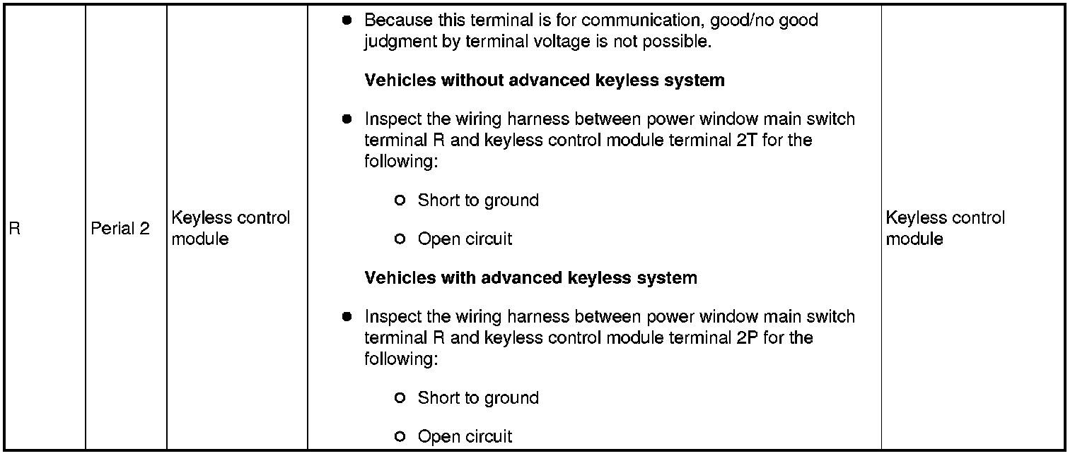 - If the voltage is not as specified in the terminal voltage table, inspect the parts under Inspection item (s) and related wiring harnesses.