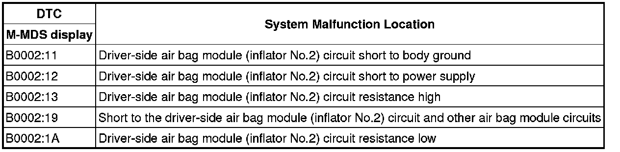 - Abnormal resistance (other than 1.76-5.06 ohms) detected in the driver-side air bag module (inflator No.2) circuit