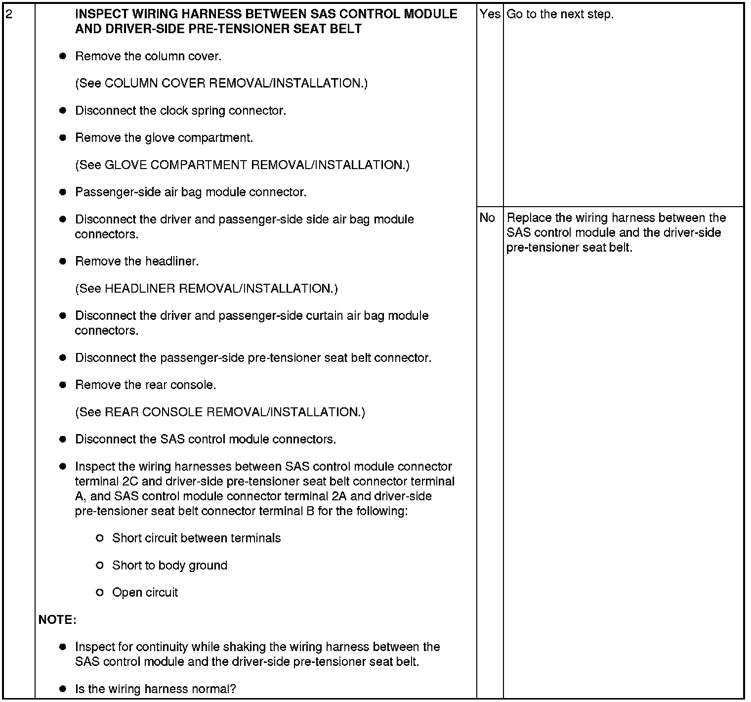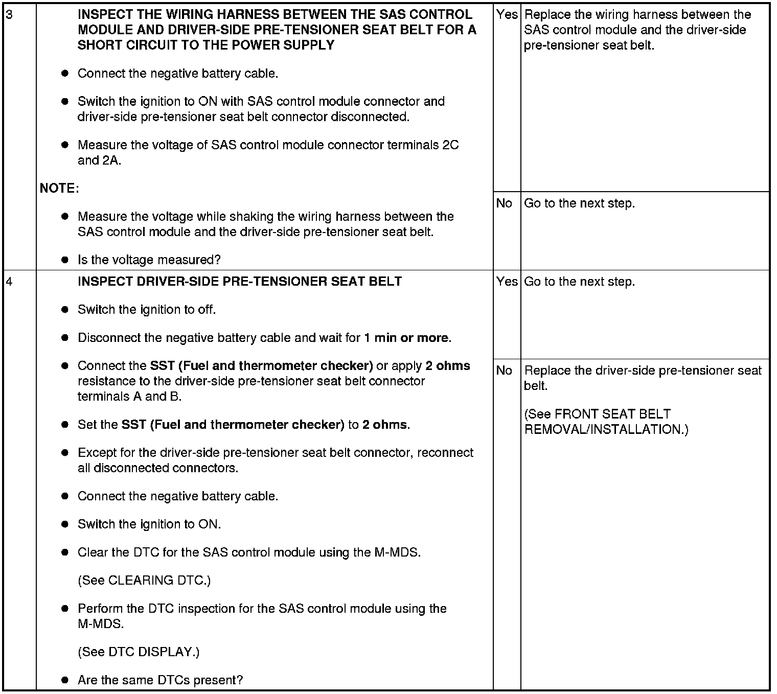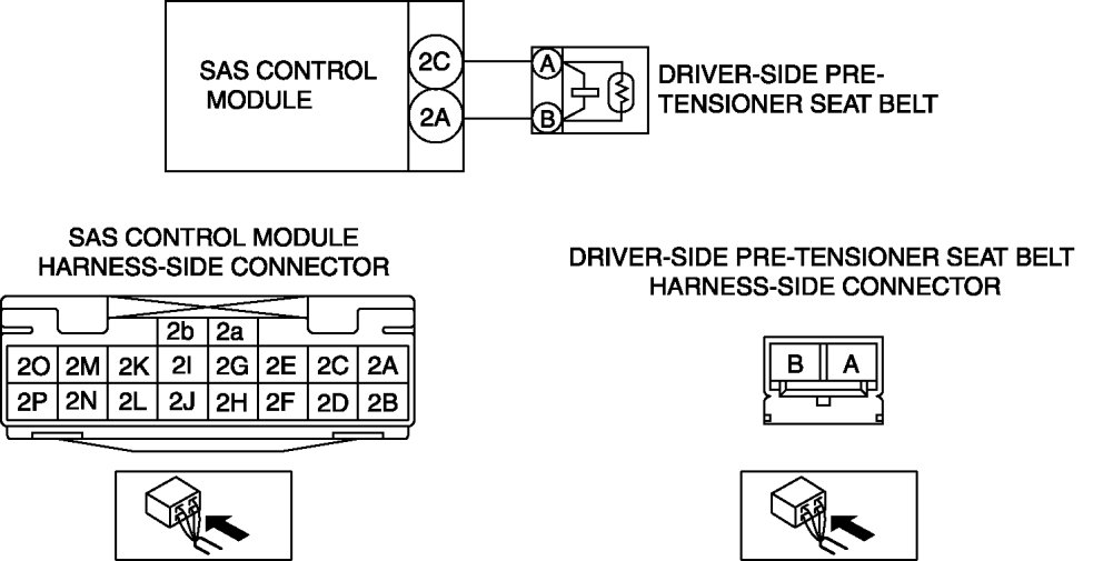 - Open or short circuit in the wiring harness between the driver-side pre-tensioner seat belt and SAS control module