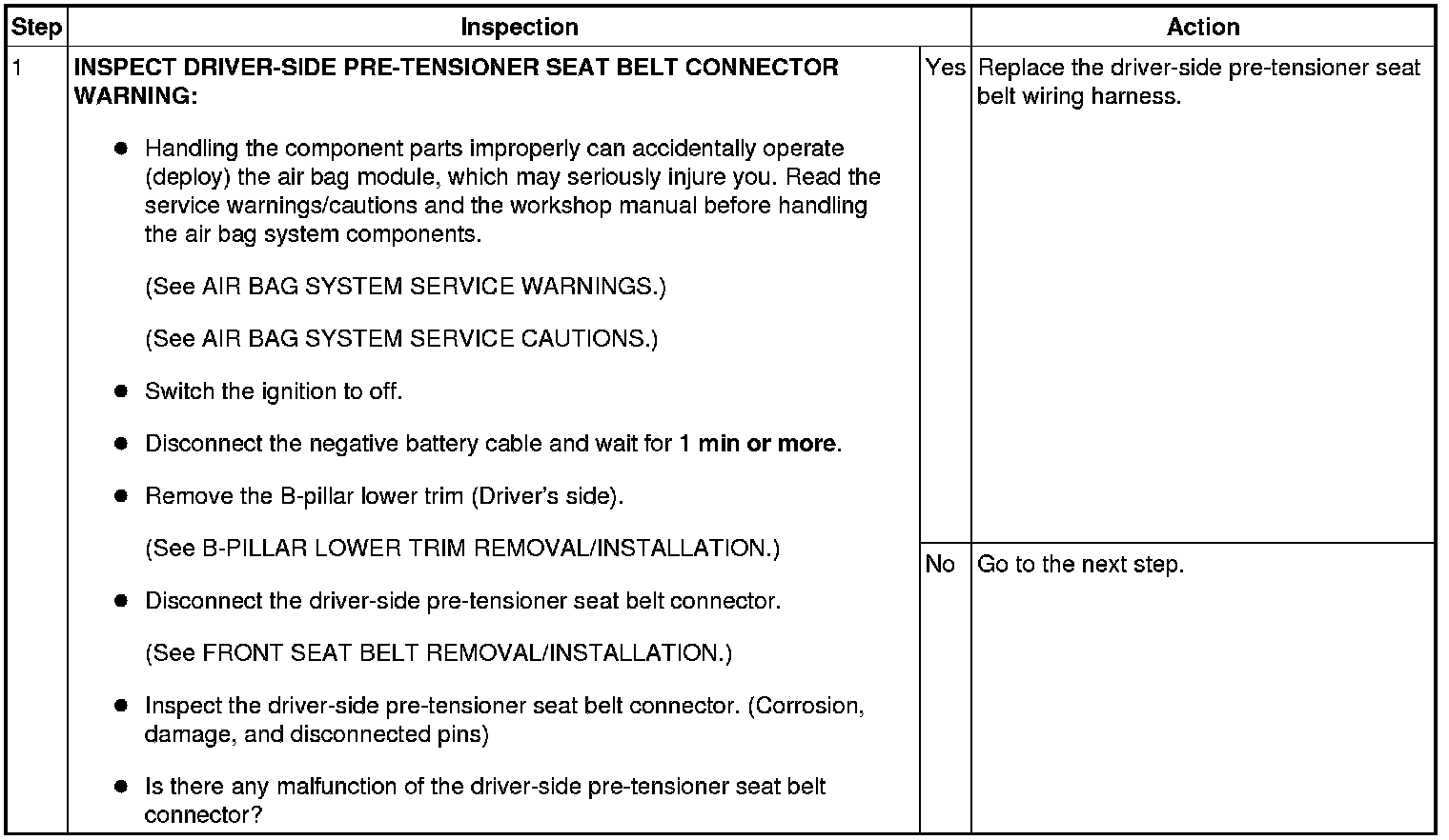 - Resistance other than 1.54-5.06 ohms detected in driver-side pre-tensioner seat belt circuit