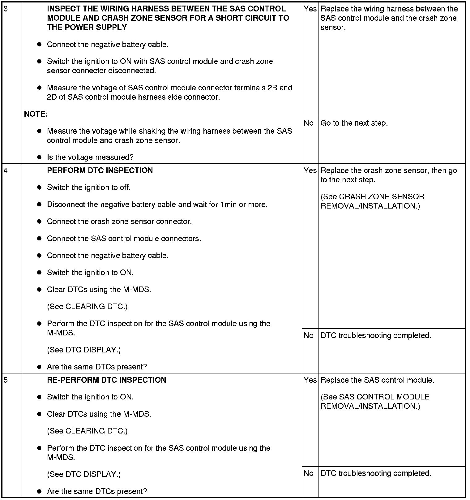 - Open or short circuit or short to ground or short to power supply in the wiring harness between the crash zone sensor and SAS control module