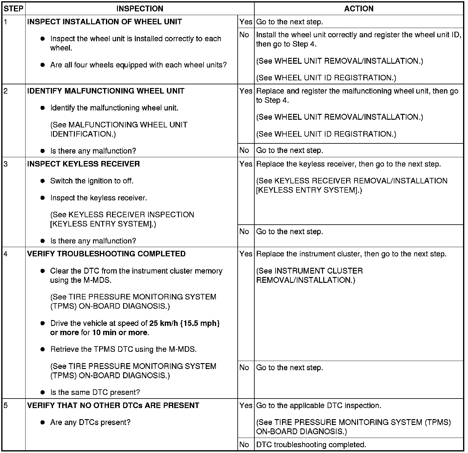 - If the wheel unit has been newly replaced, the TPMS warning light may flashes before the ID registration is complete, and DTC C2011:87, C2012:87, C2013:87 and C2014:87 may be stored in the memory. In this case, reimplement the wheel unit ID registration, and after confirming that the TPMS warning light is no longer flashing, erase the DTC. If the TPMS warning light does not go out, a malfunction on any one of the wheel units may have occurred and the ID registration will not have been correctly performed. Repeat the diagnostic procedure from Step 1 and perform and inspection.