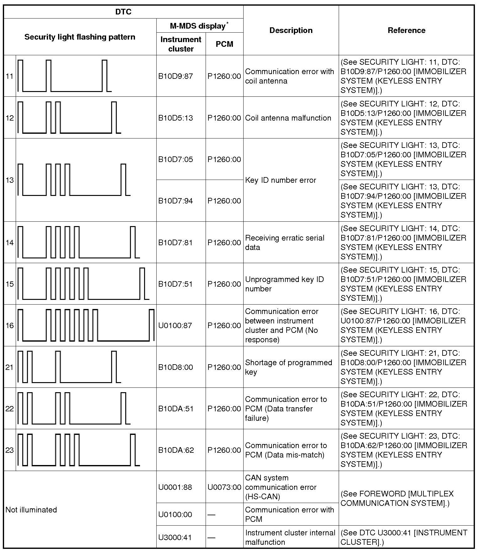 - DTC 21 or higher: Illuminates for approx. 1 min and the DTC flash pattern indicated in the table below repeats 10 times.