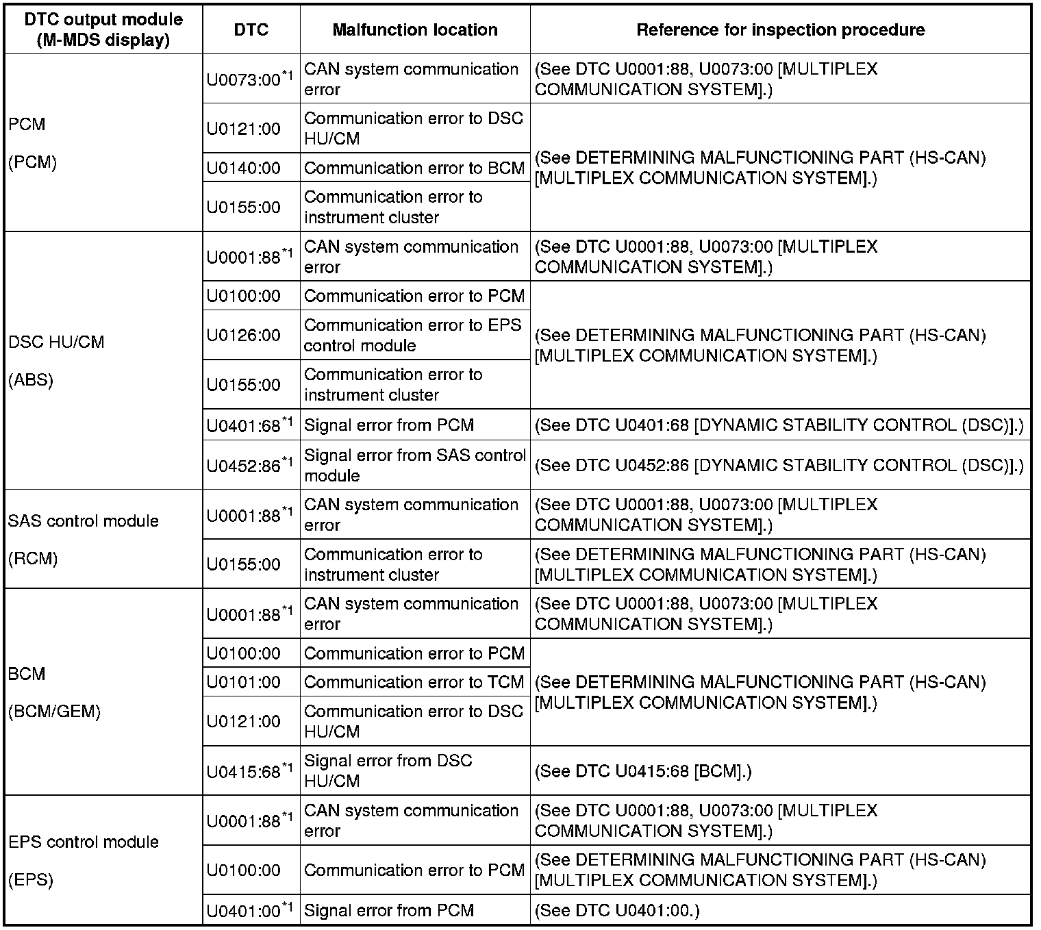 DTC TABLE [MULTIPLEX COMMUNICATION SYSTEM]