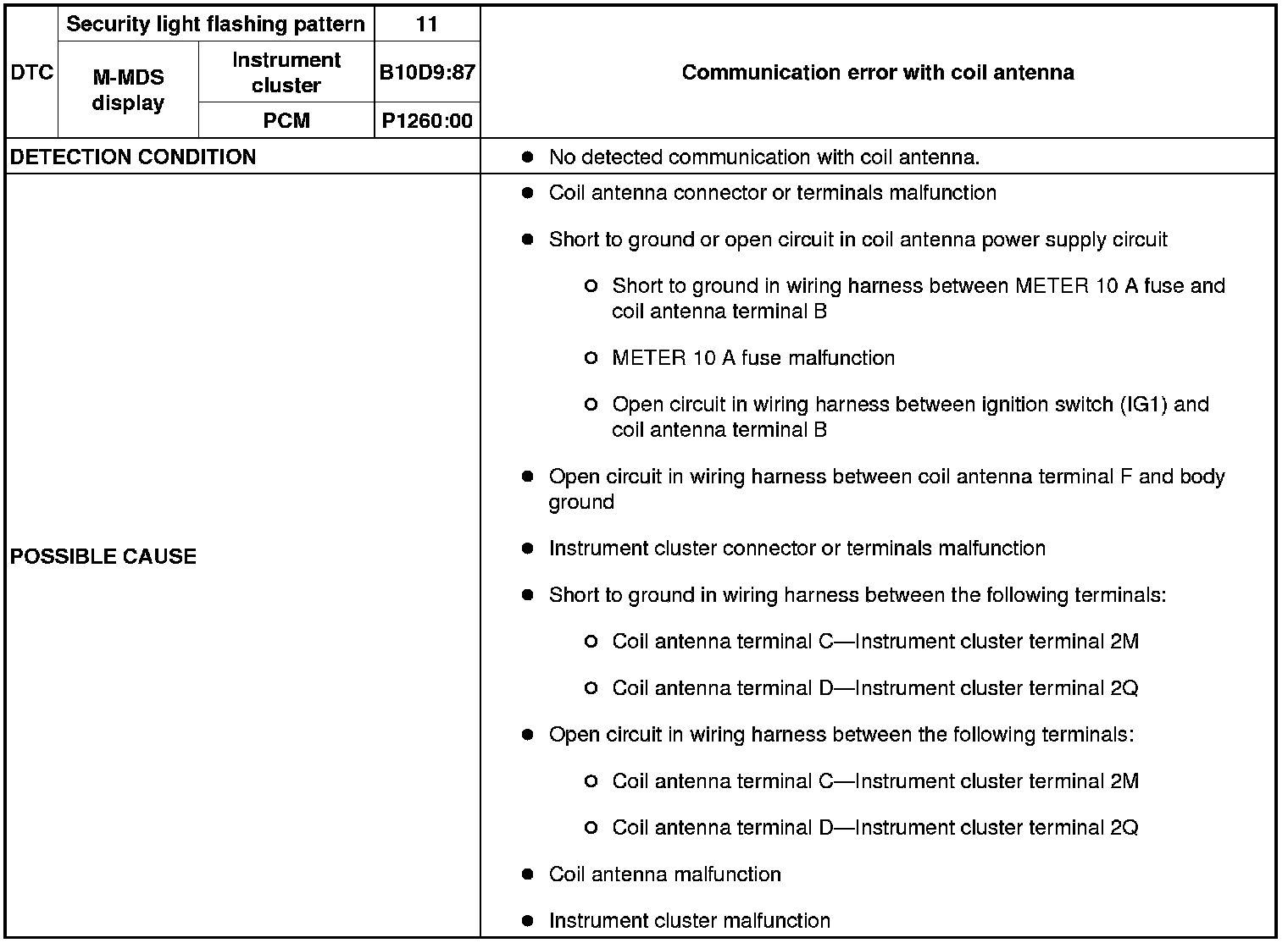 SECURITY LIGHT: 11, DTC: B10D9:87 / P1260:00 [IMMOBILIZER SYSTEM (KEYLESS ENTRY SYSTEM)]