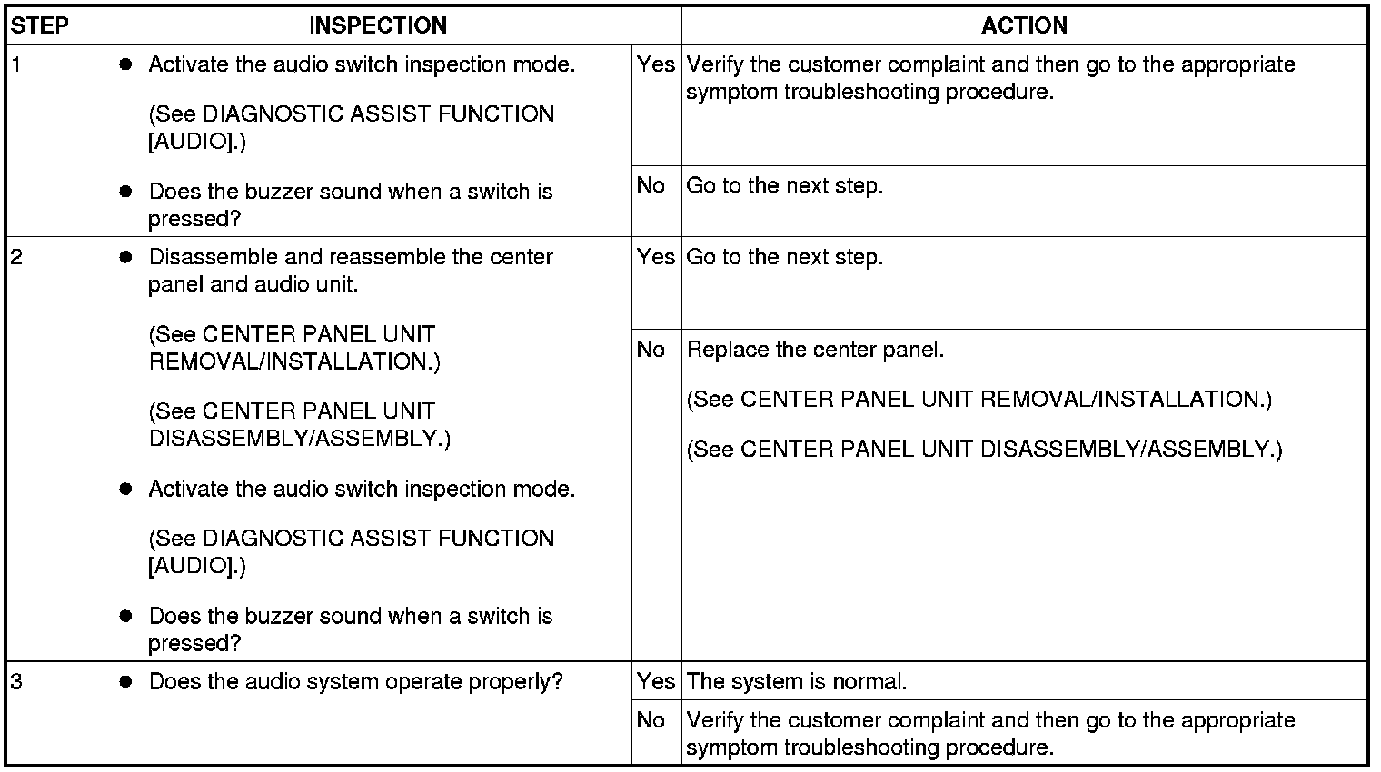 - Verify the customer complaint and identify the malfunction as occurring from either the center panel or the audio unit.