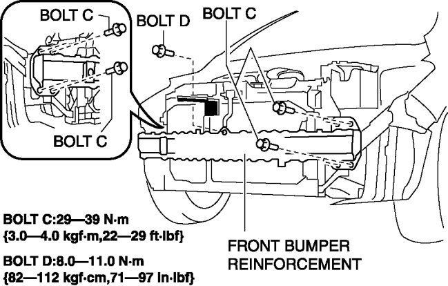 8. Remove bolts C and D then remove the front bumper reinforcement in the direction of the arrow shown in the figure.