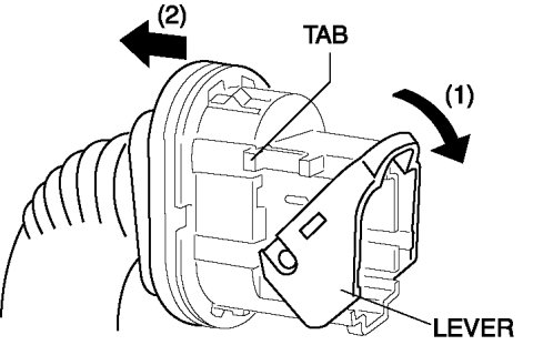 3. Lower the lever in the direction of arrow (1), and disconnect the connector in the direction of arrow (2).