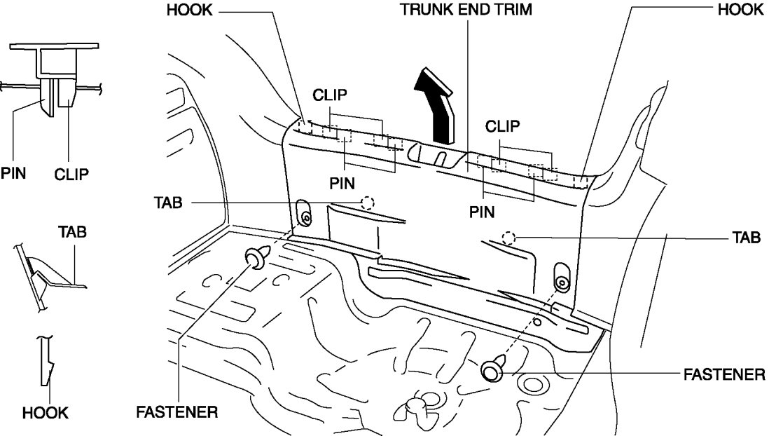 5. Pull the trunk end trim in the direction of the arrow shown in the figure and remove it while detaching the hooks, tabs, clips, and pins.