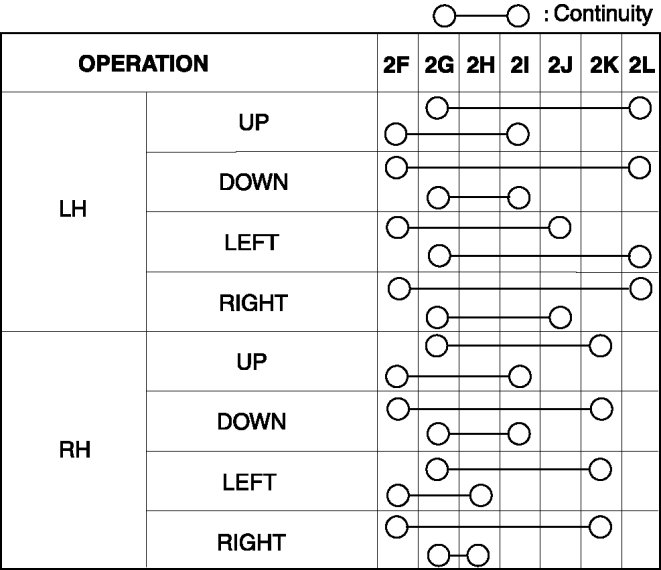 5. Using a tester, verify that the continuity between the power outer mirror switch terminals is as indicated in the table.
