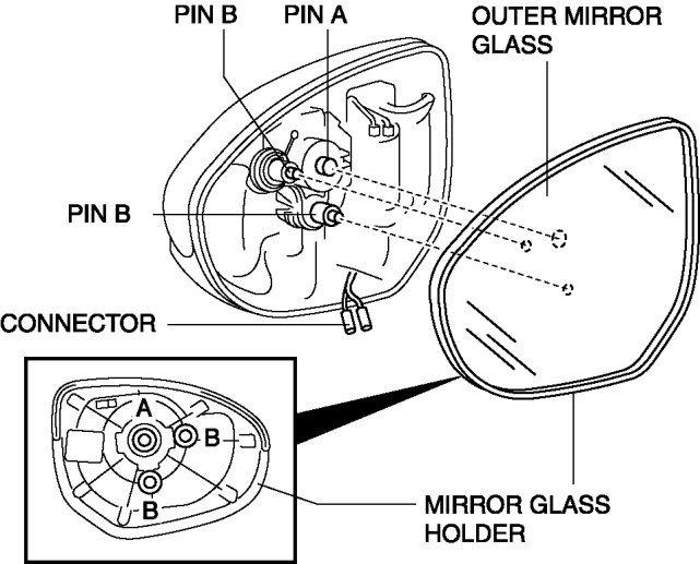 1. Connect the connector to the outer mirror glass. (Vehicles with heated outer mirror)