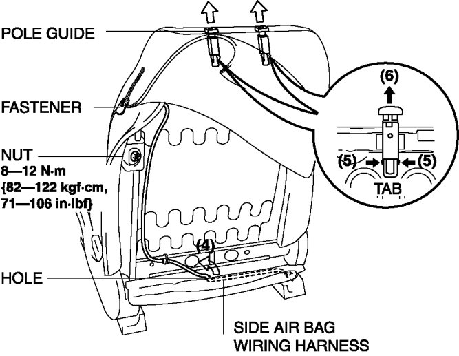 11. Partially peal back the front seat back trim, release the pole guide tabs in the direction of arrow (5) shown in the figure, then pull the pole guide out in the direction of arrow (6).