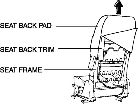 15. Remove the seat back trim and the seat back pad as a single unit from the seat frame by pulling them in the direction of the arrow.