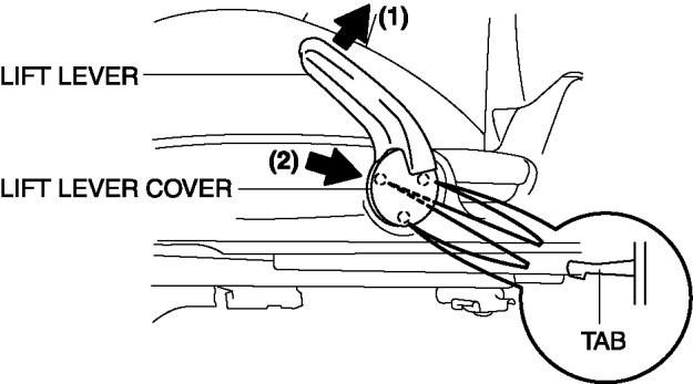 5. Insert a fastener remover from the position of arrow (2) shown in the figure, and remove the lift lever cover by disengaging the tab. (Left side of the driver's seat)