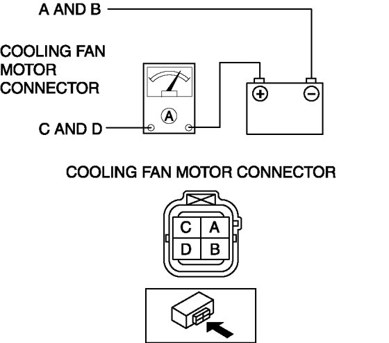 3. Install a tester and battery to the cooling fan motor connector (4 terminals) as shown in the figure.