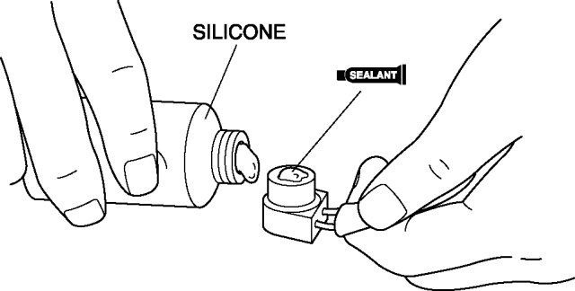1. Apply approx. 1 g {0.04 oz} of silicone (Shin-Etsu Silicone KE-347W or similar) to the contact surface of the thermal protector, then thoroughly install it onto the A/C compressor, leaving no gaps.