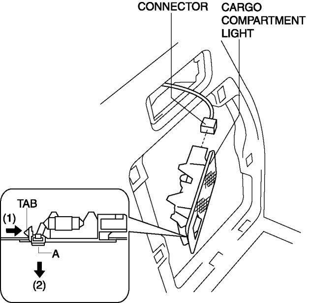 2. Insert hand through the service hole, release the tab in the direction of the arrow (1) shown in the figure, and pull area A in the direction of the arrow (2) to remove the cargo compartment light.