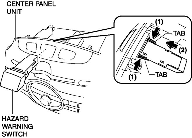 3. Remove the hazard warning switch in the direction of the arrow (2) shown in the figure while pressing the tabs in the direction of the arrow (1).