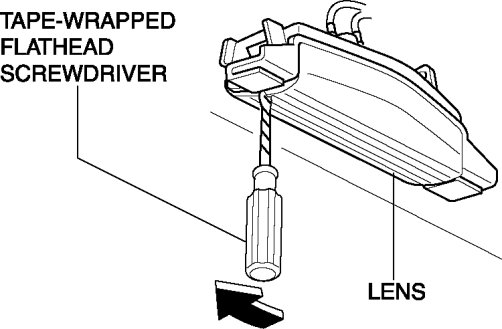 2. Insert a tape-wrapped flathead screwdriver into the service hole, push it in the direction of the arrow, and remove the lens.
