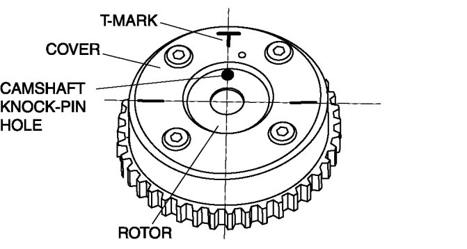 - If the camshaft knock pin hole and the T-mark of the cover do not align, rotate the crankshaft two times in the direction the engine rotates, and then verify that they are aligned.