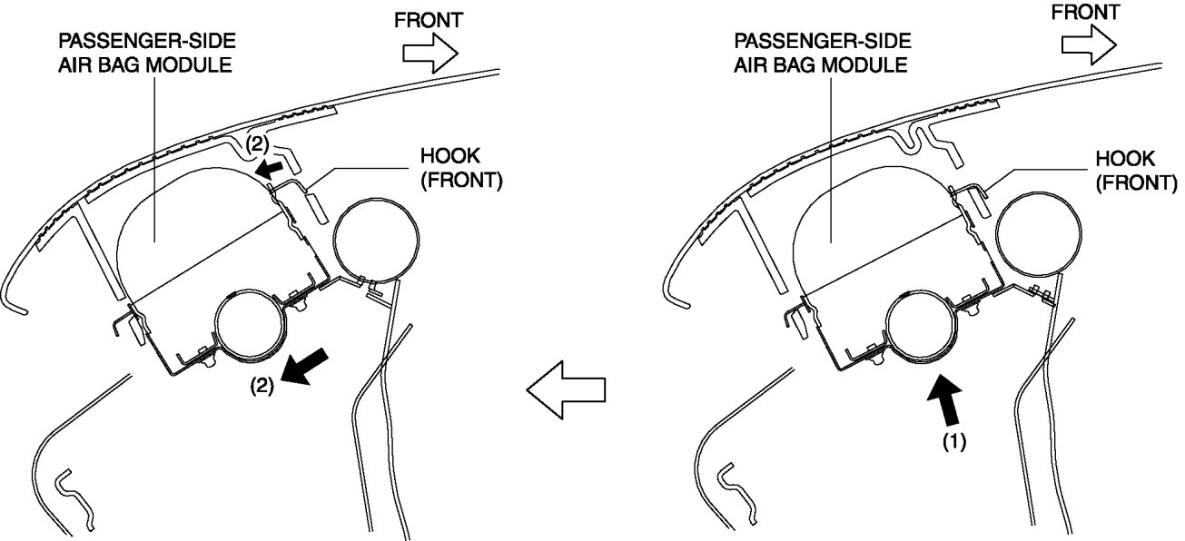 8. Pull the passenger-side air bag module in the direction of arrow (2) and detach the hook (front) from the instrument panel.