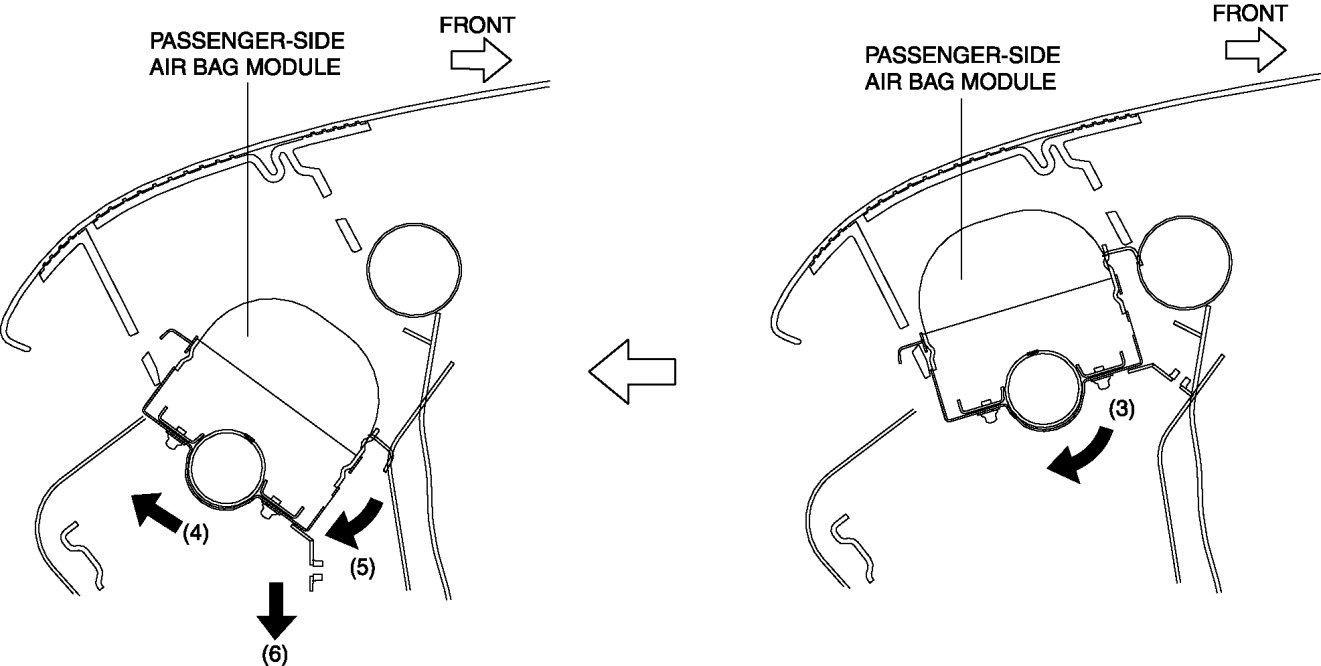 10. Press the passenger-side air bag module in the direction of arrow (4) and rotate it in the direction of arrow (5).