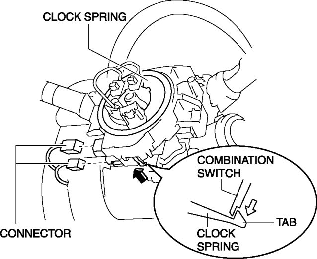 5. Press and detach the tab of the clock spring in the direction of the arrow of the clock spring in the position shown in the figure.
