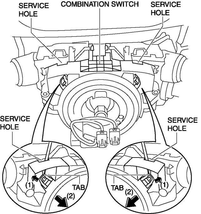 6. Insert a flathead screwdriver into the service hole of the combination switch in the position shown in the figure, and detach the tab of the clock spring.