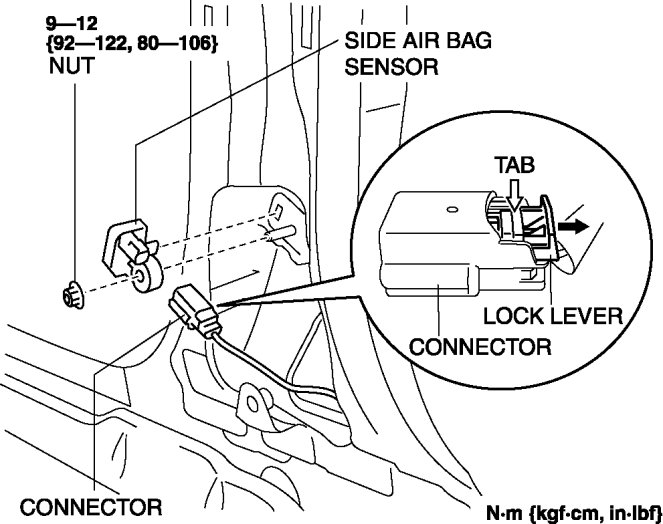 6. Disconnect the connector from the side air bag sensor by pressing the connector tab and pulling out the lock lever in the direction of the arrow.