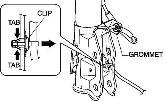 2. While pressing the tabs (2 locations) of the ABS wheel-speed wiring harness sensor clip, remove the ABS wheel-speed sensor wiring harness from the shock absorber.