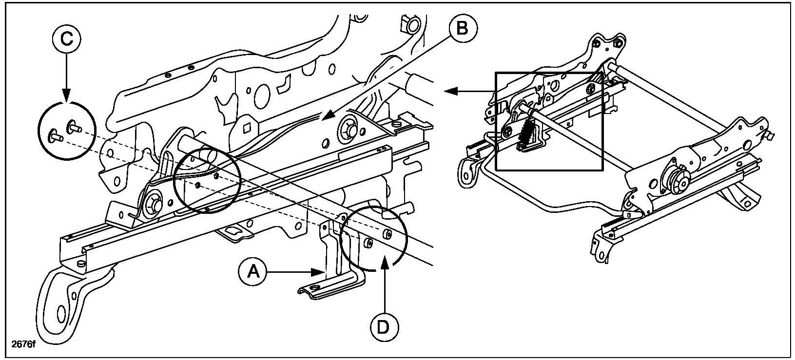 5. Mazda2: Attached the spring bracket (A) to the seat frame (B) with the two screws (C) and nuts (D).