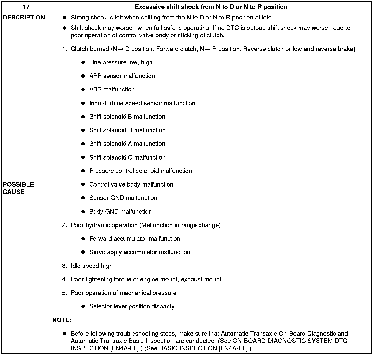 NO.17 EXCESSIVE SHIFT SHOCK FROM N TO D OR N TO R POSITION [FN4A-EL]