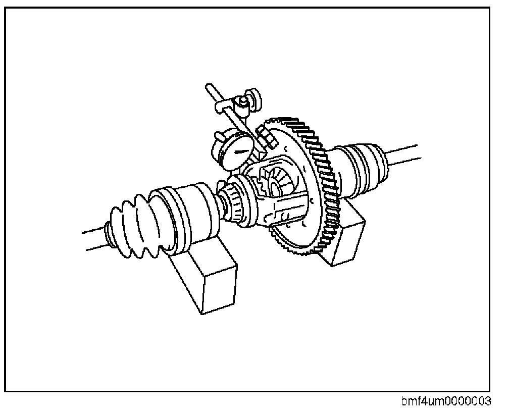 - If not within the specification, adjust by selecting and installing thrust washers between the case and the side gears.