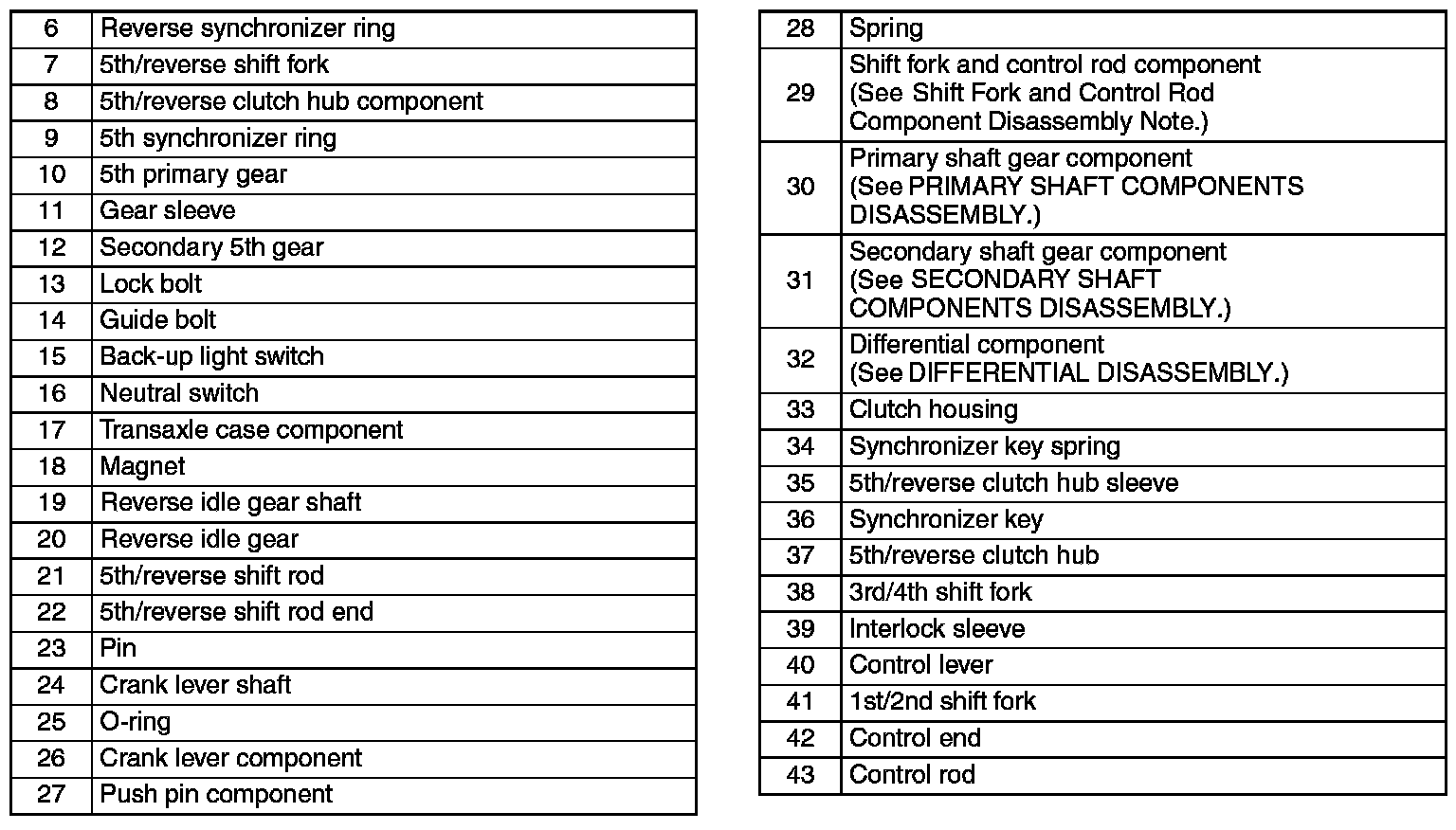 5TH/REVERSE GEAR AND HOUSING PARTS DISASSEMBLY1. Disassemble in the order indicated in the table.