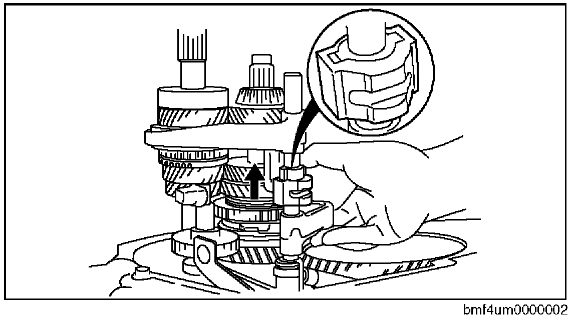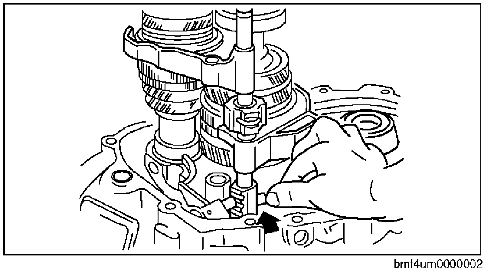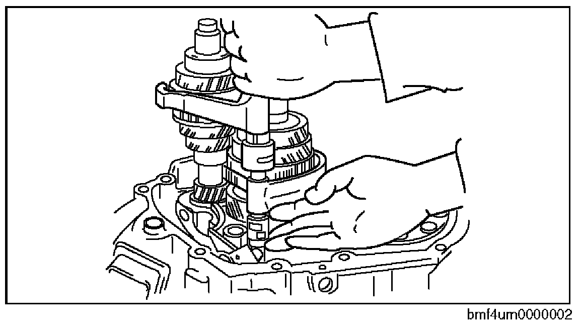 2. While holding the 1st/2nd shift fork with one hand and the 3rd/4th shift fork with the other, raise them both at the same time and shift each of the clutch hub sleeves.