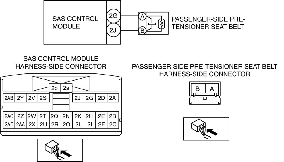 - Open or short circuit or short to ground or short to power supply in the wiring harness between the passenger-side pre-tensioner seat belt and SAS control module