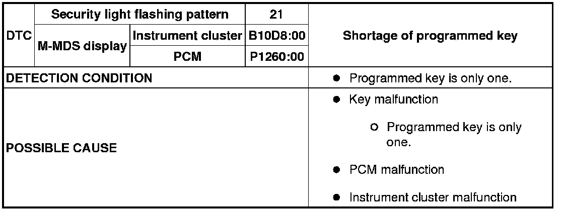 SECURITY LIGHT: 21, DTC: B10D8:00 / P1260:00 [IMMOBILIZER SYSTEM (KEYLESS ENTRY SYSTEM)]