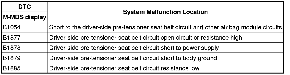 - Resistance other than 1.10-5.77 ohms detected in driver-side pre-tensioner seat belt circuit