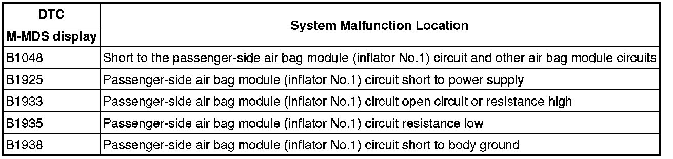 - Resistance other than 1.10-5.77 ohms detected in passenger-side air bag module (inflator No.1) circuit